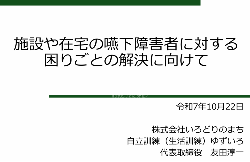 令和7年度の東部圏域別杵速見地域リハビリテーション広域支援センター研修会では、10月に『自立訓練(生活訓練)ゆずいろ』の言語聴覚士・友田淳一氏を講師にお招きし、嚥下障害への支援についてご講義いただきました。