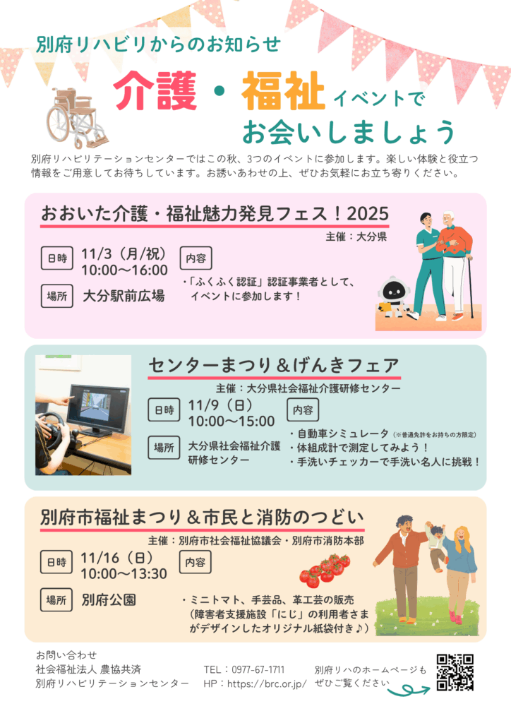 別府リハビリテーションセンターでは、より多くのみなさまに別府リハを身近に感じていただくため、地域の様々なイベントへの参加を予定しています。